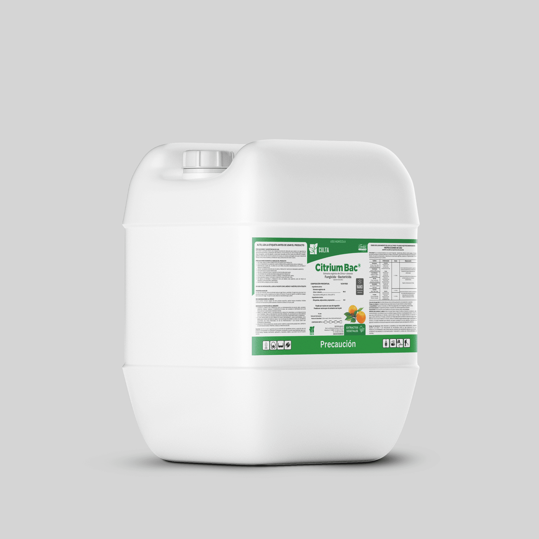 Extracto botánico de Cítricos (Citrus spp.) con acción fungicida- bactericida. Altera la permeabilidad de la membrana celular del fitopatógeno. Es eficaz en tratamientos preventivos, así como curativos.